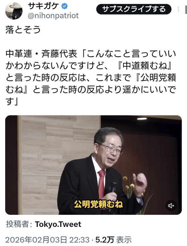 1:2026/02/04(水) 08:36:51.18 ID:YyEUOWYT0落とそう中革連・斉藤代表「こんなこと言っていいかわからないんですけど、『中道頼むね』と言った時の反応は、これまで『公明党頼むね』と言った時の反応より遥かにいいです」 pic.twitter.com/O7b5zs71IY— サキガケ (@nihonpatriot) February 3, 2026
