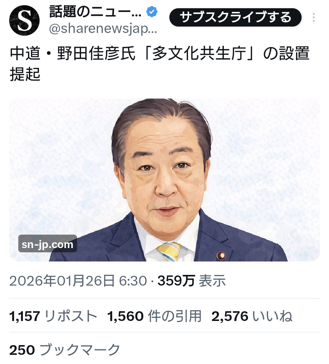 1:2026/01/28(水) 10:41:19.60 ID:Xl+Eoq9l0中道・野田佳彦氏「多文化共生庁」の設置提起 https://t.co/PWhlxBRg2D— 話題のニュースとネットの反応 (@sharenewsjapan1) January 25, 2026立憲民主党 政策集2025「多文化共生社会(外国人)」 - 立憲民主党https://cdp-japan.jp/visions/policies2025/09