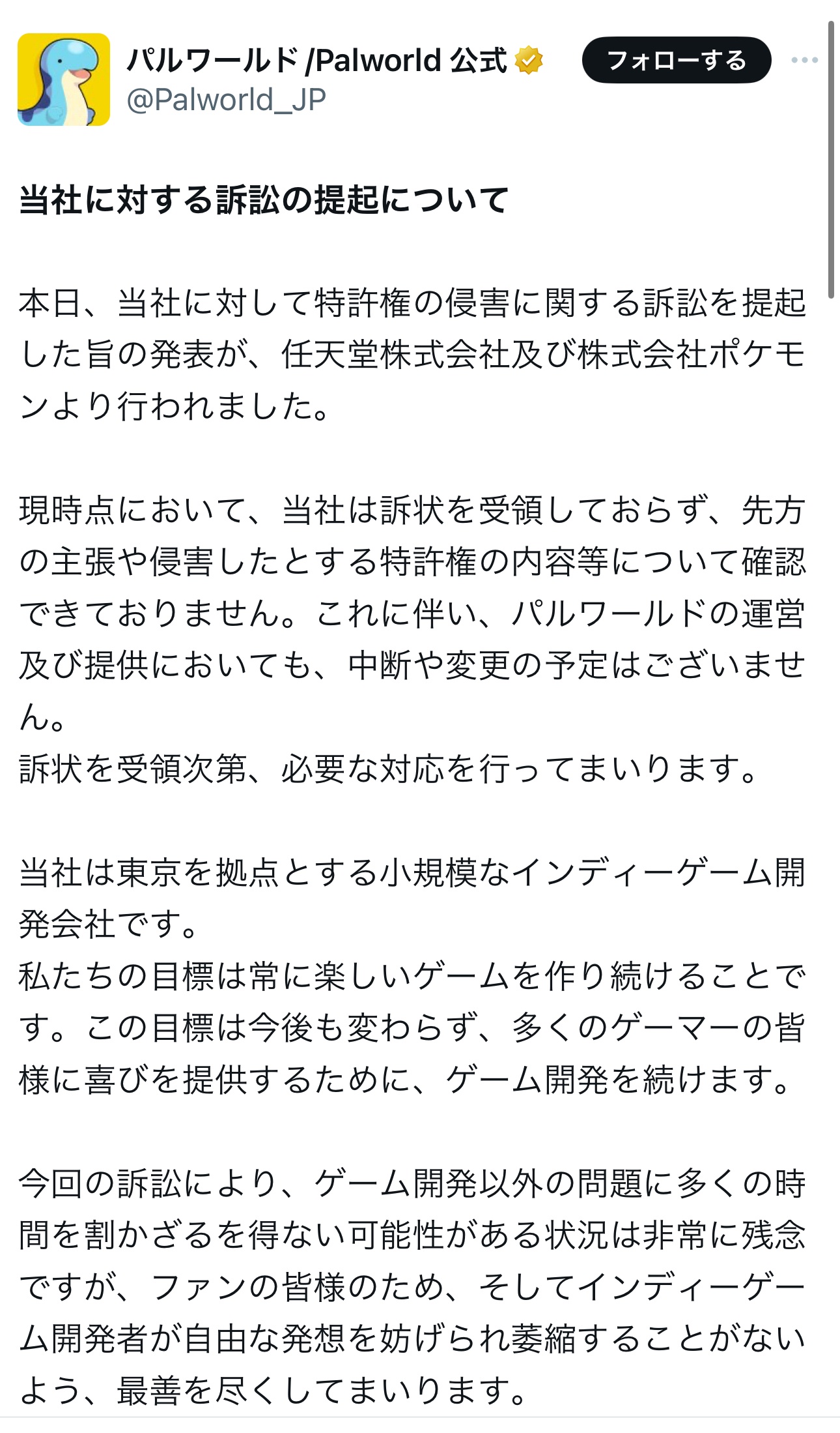 当社に対する訴訟の提起について本日、当社に対して特許権の侵害に関する訴訟を提起した旨の発表が、任天堂株式会社及び株式会社ポケモンより行われました。…— パルワールド/Palworld 公式 (@Palworld_JP) September 19, 2024転載元スレッド:https://viper.2ch.sc/test/read.cgi/news4vip/1726756443/続きを読む