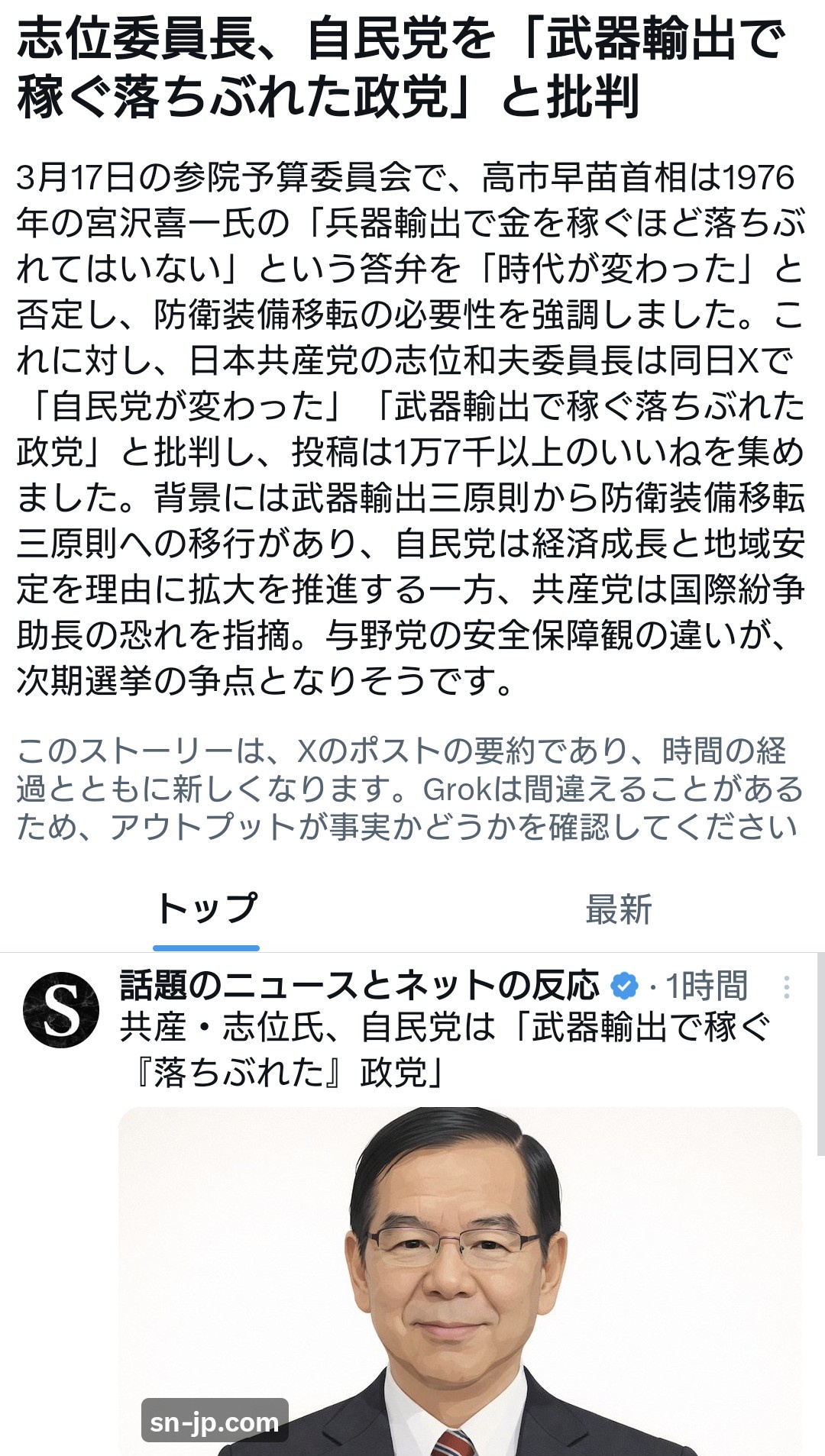 3月17日の参院予算委員会で、高市早苗首相は1976年の宮沢喜一氏の「兵器輸出で金を稼ぐほど落ちぶれてはいない」という答弁を「時代が変わった」と否定し、防衛装備移転の必要性を強調しました。これに対し、日本共産党の志.位.和.夫.委員長は同日Xで「自民党が変わった」「武器輸出で稼ぐ落ちぶれた政党」と批判し、投稿は1万7千以上のいいねを集めました。背景には武器輸出三原則から防衛装備移転三原則への移行があり、自民党は経済成長と地域安定を理由に拡大を推進する一方、共産党は国際紛争助長の恐れを指摘。与野党の安全保障観の違いが、次期選挙の争点となりそうです。転載元スレッド:https://hayabusa3.2ch.sc/test/read.cgi/news/1773794346/続きを読む