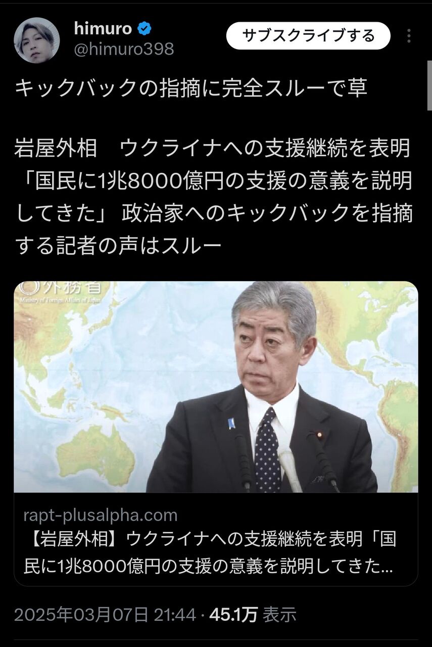 キックバックの指摘に完全スルーで草岩屋外相 ウクライナへの支援継続を表明「国民に1兆8000億円の支援の意義を説明してきた」 政治家へのキックバックを指摘する記者の声はスルー https://t.co/7yov1nihD0— himuro (@himuro398) March 7, 2025転載元スレッド:https://viper.2ch.sc/test/read.cgi/news4vip/1741497774/