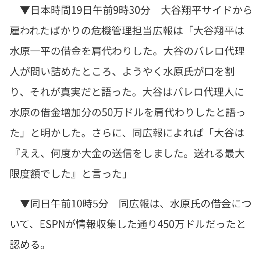 1 名前:名無しさん@おーぷん[] 投稿日:24/03/24(日) 07:53:46 ID:zvoI19日の大谷翔平のコメントとして「何度か大金の送信をしました。送れる最大限度額でした」水原氏の借金を肩代わりしたと米ESPNが報道https://www.chunichi.co.jp/article/872796まずいのでは、、、2 名前: