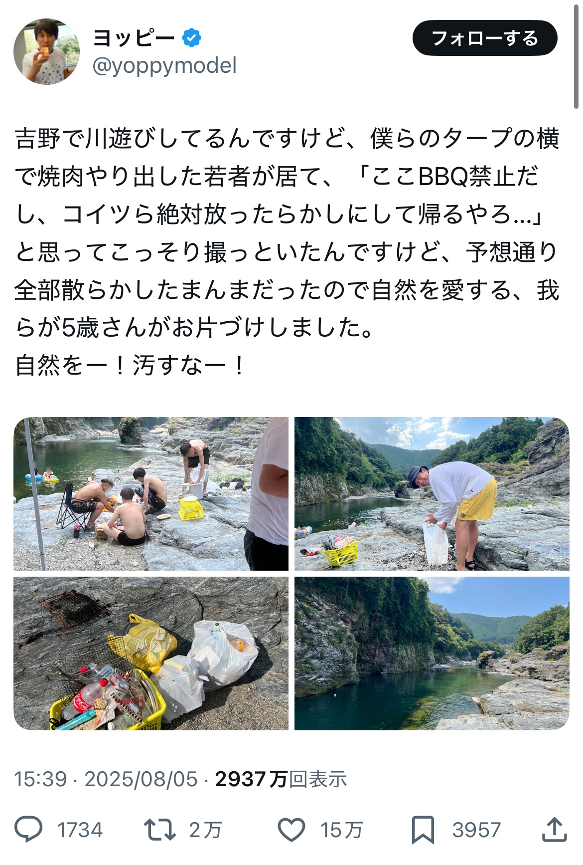 やっぱツイカスってゴミだわ吉野で川遊びしてるんですけど、僕らのタープの横で焼肉やり出した若者が居て、「ここBBQ禁止だし、コイツら絶対放ったらかしにして帰るやろ…」と思ってこっそり撮っといたんですけど、予想通り全部散らかしたまんまだったので自然を愛する、我らが5歳さんがお片づけしました。自然をー!汚すなー!