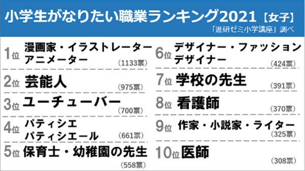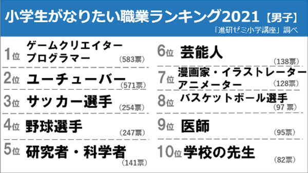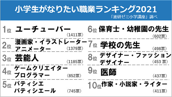 1 : ネギうどん ★ :2021/12/18(土) 14:17:05.93 ID:CAP_USER9.net2021年の年末、「進研ゼミ小学講座」では、「2021年の出来事や将来に関する小学生の意識調査」を実施しました。その中でも今回は、「小学生がなりたい職業」をご紹介します。社会の変化を、子どもたちはどのようにとらえているのでしょうか。気になるランキングは最後に発表します。(省略)全文 https://benesse.jp/juken/202112/20211217-1.html総合