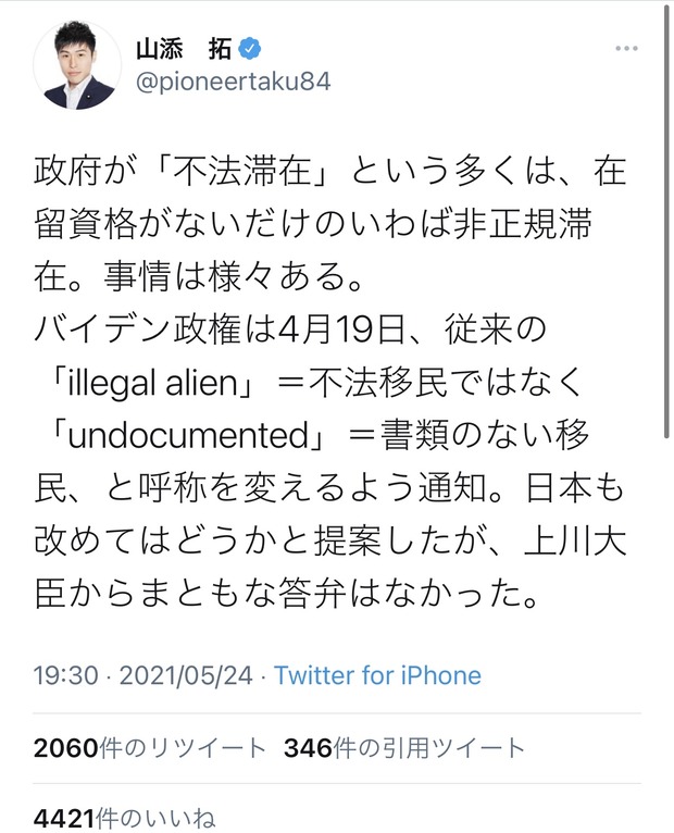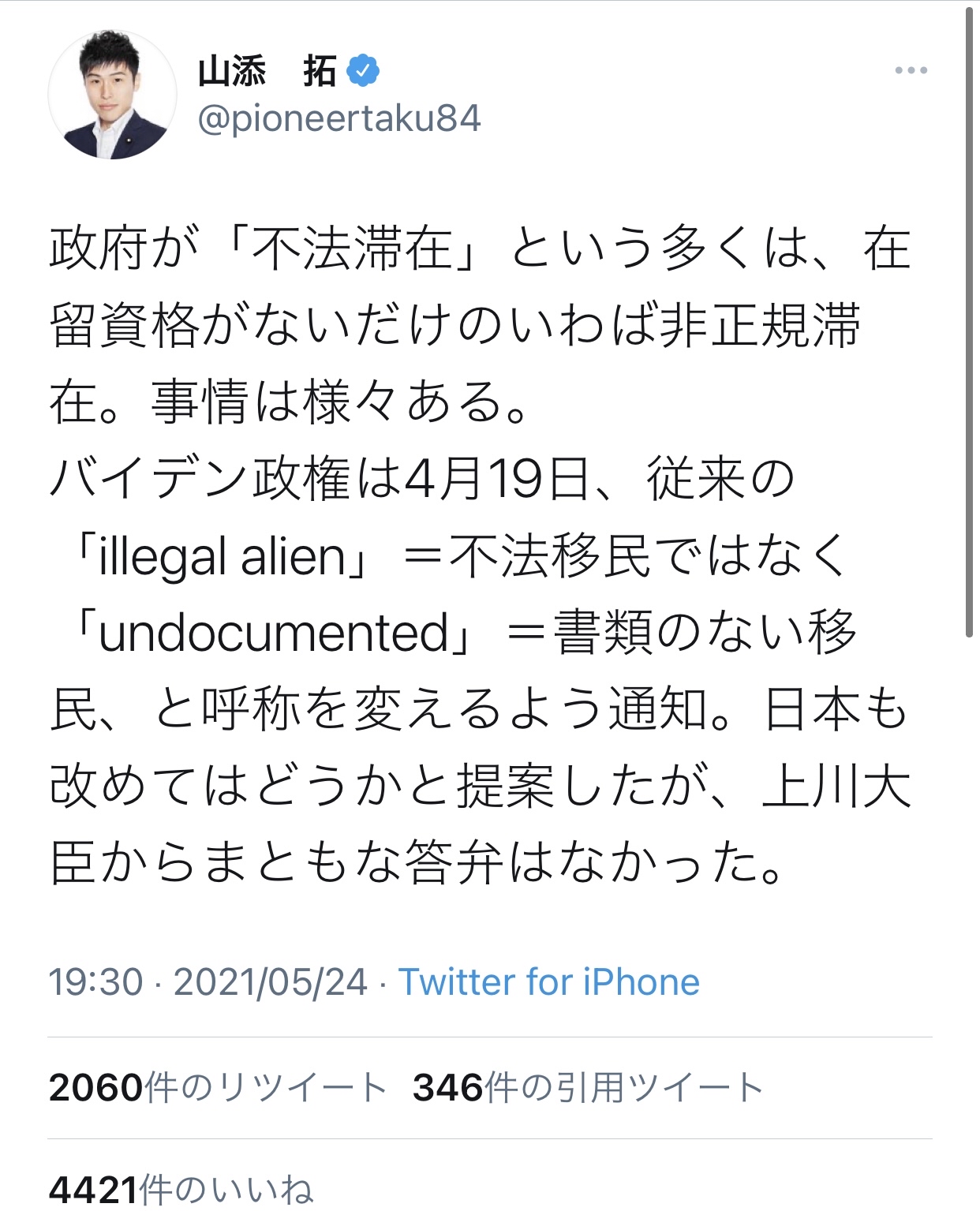 政府が「不法滞在」という多くは、在留資格がないだけのいわば非正規滞在。事情は様々ある。バイデン政権は4月19日、従来の「illegal alien」=不法移民ではなく「undocumented」=書類のない移民、と呼称を変えるよう通知。日本も改めてはどうかと提案したが、上川大臣からまともな答弁はなかった。— 山添 拓 (@pioneertaku84)