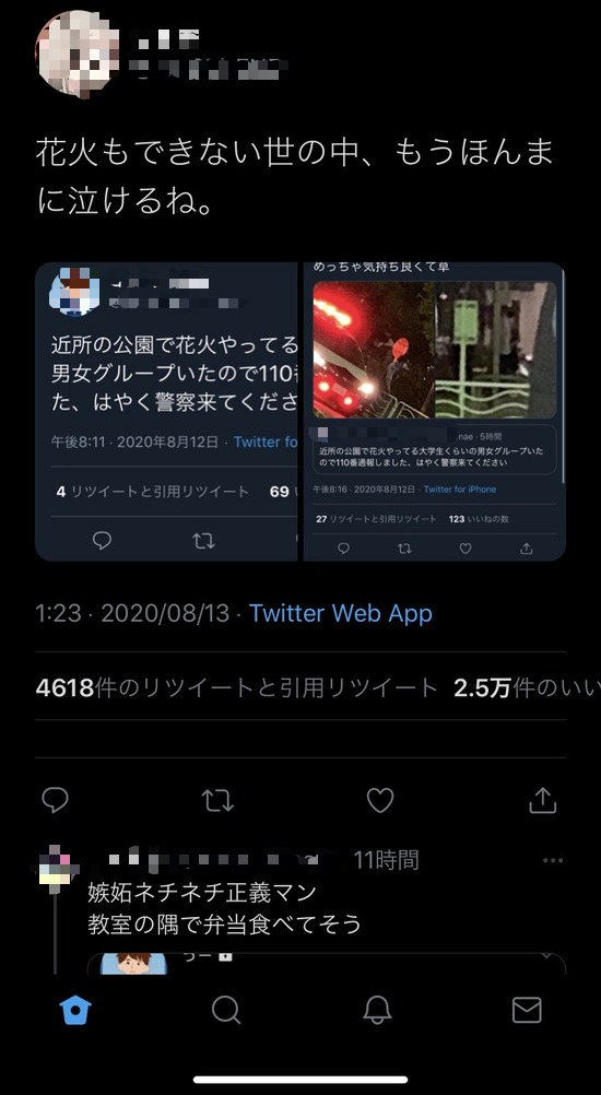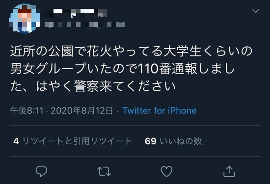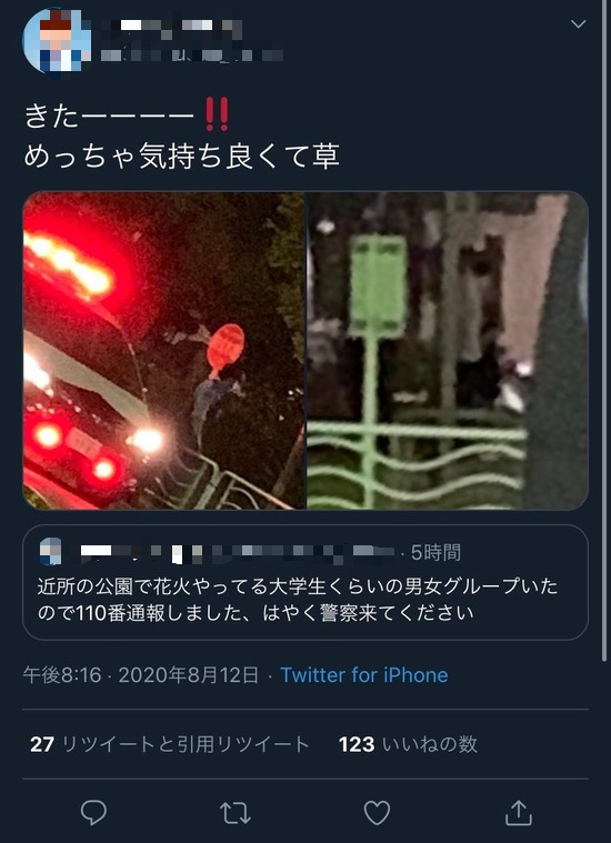 彡(●)(●)「男女カップルが公園で花火しとる...せや!通報や!」→2.5万いいねwww