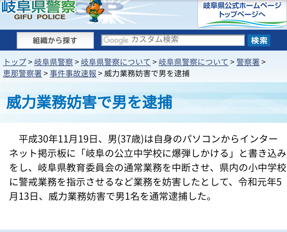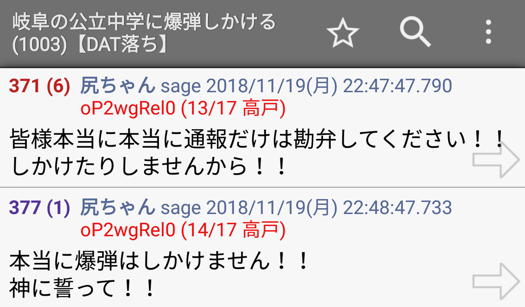彡(゚)(゚)「学校に爆弾仕掛けた。覚悟しろ」→ 彡(。)(;)「ごめんなさい嘘です許してください!!!」→