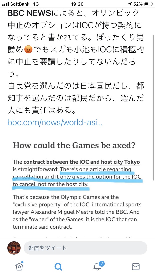 IOCと開催都市・東京都の契約(日本語版はこちら)は、明確だ。開催契約を解除し、開催を中止する権利はIOCのみにある。開催都市側に、その規定はない。なぜかというと、オリンピック大会はIOCの「独占的財産」だからだと、国際スポーツ法を専門とするアレクサンドル・ミゲル・メストレ弁護士は、BBCに説明した。オリンピックの「所有者」として、開催契約を解除できるのはIOCなのだという。(抜粋)全文BBC