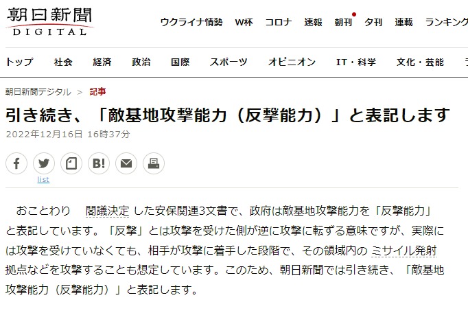 このため、朝日新聞では引き続き、「敵基地攻撃能力(反撃能力)」と表記します。https://www.asahi.com/articles/ASQDJ5H7WQDHUTFK02H.html 続きを読む