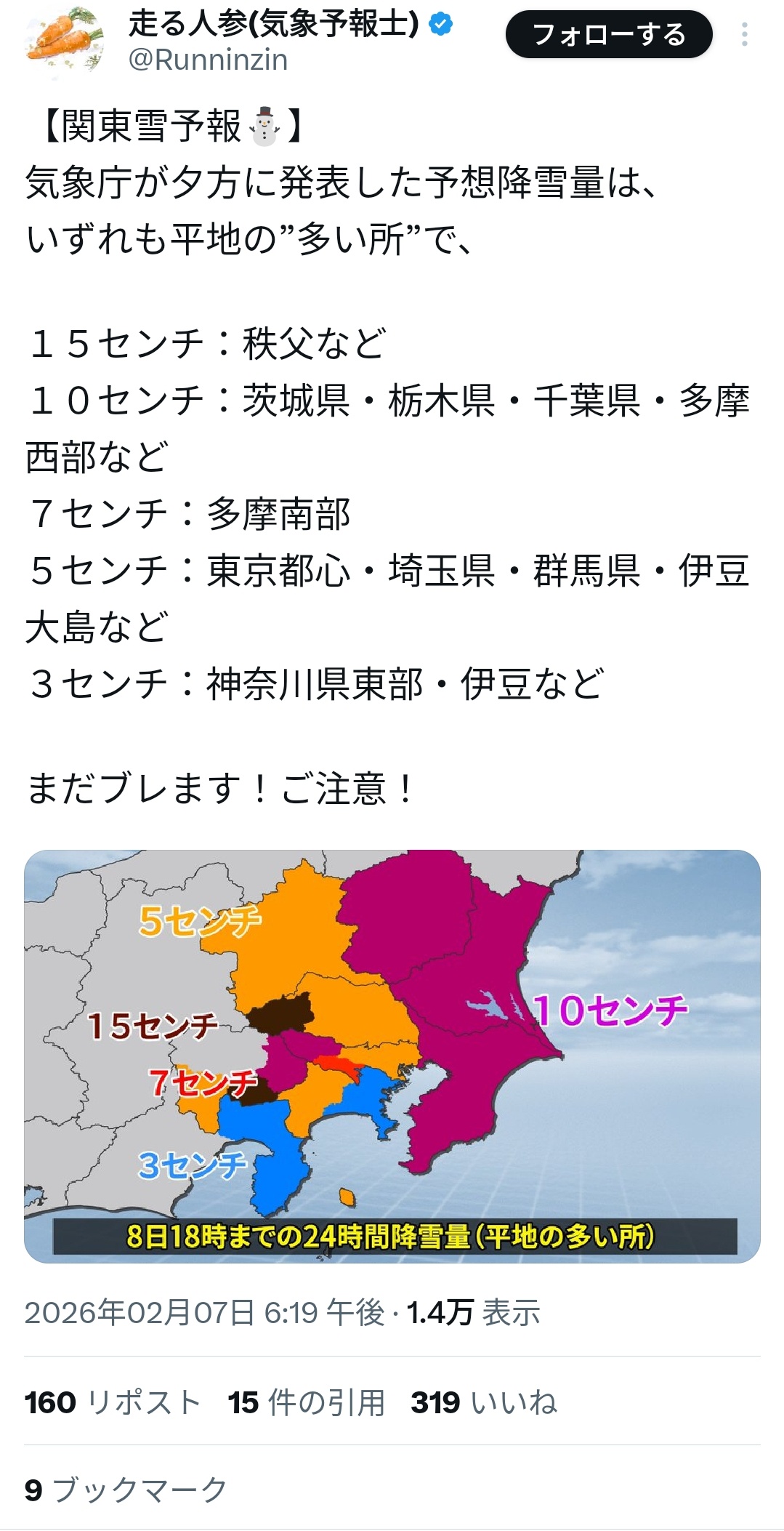 【関東雪予報⛄】気象庁が夕方に発表した予想降雪量は、いずれも平地の”多い所”で、15センチ:秩父など10センチ:茨城県・栃木県・千葉県・多摩西部など7センチ:多摩南部5センチ:東京都心・埼玉県・群馬県・伊豆大島など3センチ:神奈川県東部・伊豆などまだブレます!ご注意!