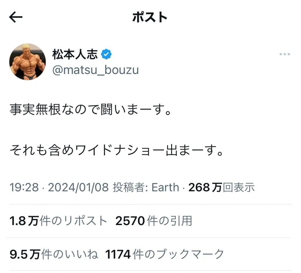 1 名前:名無しさん@おーぷん[] 投稿日:24/02/21(水) 18:18:23 ID:NByK怖くね?マジでいつ何が起こるかわかんないじゃん2 名前:名無しさん@おーぷん[] 投稿日:24/02/21(水) 18:18:37 ID:fkaK紳助レベルでも消されたし6 名前:名無しさん@おーぷん[] 投稿日:24/02/21(水) 18:20:10 ID:bKtIVIPバリアを過信した7 名前:名無しさん@おーぷん[] 投稿日:24/02/21(水) 18:20:35 ID:zKSo紳助の時に気づけよ9 名前:名無しさん@おーぷん[] 投稿日:24/02/21(水) 18:21:10 ID:rKPp芸能界というかテレビが未だに自分たちがブームを作ってるって認識だからな11 名前:名無しさん@おーぷん[] 投稿日:24/02/21(水) 18:21:16 ID:NByK大御所とかなんの関係もないよな何十年培った地位もちょっとやらかせば終わり18 名前:名無しさん@おーぷん[] 投稿日:24/02/21(水) 18:24:10 ID:NByK今までタブーだった長渕ですら牙が向いてきてるしほんまいつ消されるかわからん世界やな続きを読む