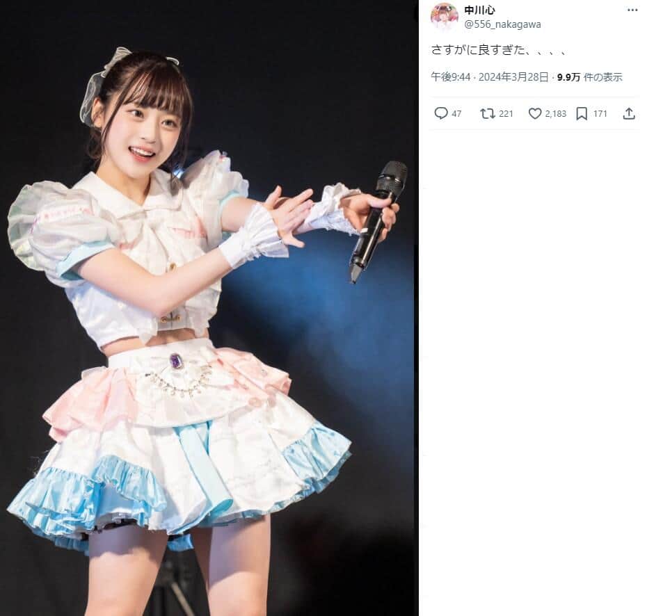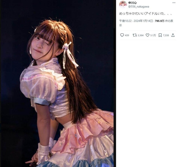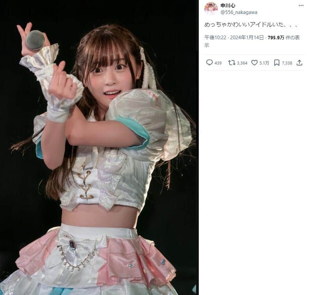 2024.04.21 18:00ライブを中心に活動する、いわゆる「地下アイドル」グループ「あまいものつめあわせ」メンバーの中川心さんが、2024年4月17日頃から、Xで「可愛すぎる」などとして注目を集めている。中川さんも反響を受け、同日にXで自身をアピールする投稿をしている。17日、あるXユーザーが中川さんのライブ中の写真とともに、中川さんが可愛いという趣旨の投稿をした。(省略)全文