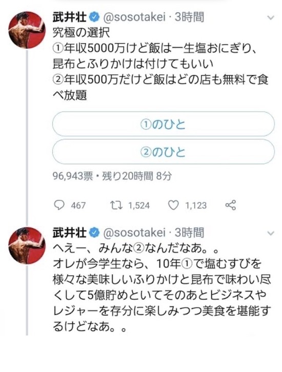 武井壮「年収5000万で一生塩むすびか、年収500万だが、ただでメシ食える。どっち選ぶ」