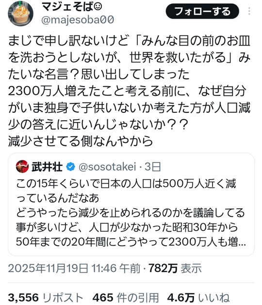 武井壮「どうして日本の人口が減るんだ!昭和の頃は増えてた!」X民「金もあって女も選べるお前が独身な理由考えてみ?」→ブチギレへ