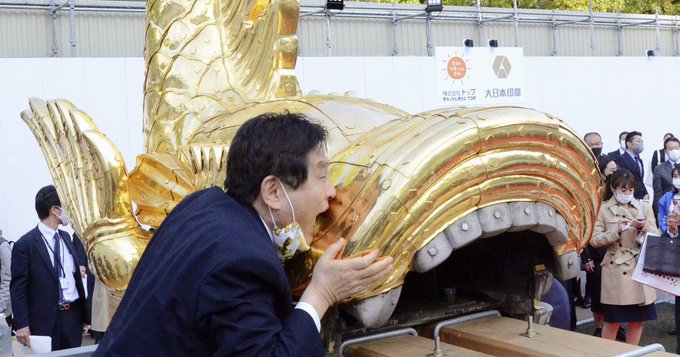 金しゃちに触れられる特別展覧の開会式に出席した河村氏は、関係者が大勢残った会場で雄しゃちに接近、着けていたマスクを外して前傾姿勢で鼻先に口を近づけた。— 産経ニュース (@Sankei_news)
