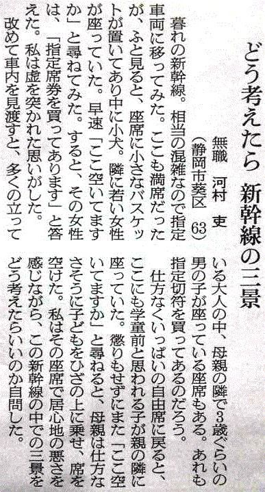 1 : 以下、?ちゃんねるからVIPがお送りします :2025/08/14(木) 19:20:25.612 ID:YKkKdnGA0.net朝日新聞 投書【どうかんがえたら 新幹線の三景】 無職 河村 吏 (静岡市葵区 63) 暮れの新幹線。相当の混雑なので指定車両に移ってみた。ここも満席だったが、ふと見ると、座席に小さなバスケットが置いてあり中に小犬。隣に若い女性が座っていた。早速「ここ空いてますか」と尋ねてみた。すると、その女性は、「指定席券を買ってあります」と答えた。私は虚を突かれた思いがした。 改めて車内を見渡すと、多くの立っている大人の中、母親の隣で3歳ぐらいの男の子が座っている座席もある。あれも指定切符を買ってあるのだろう。 仕方なくいっぱいの自由席に戻ると、ここにも学童前と思われる子が親の隣に座っていた。懲りもせずにまた「ここ空いてますか」と尋ねると、母親は仕方なさそうに子どもをひざの上に乗せ、席を空けた。私はその座席で居心地の悪さを感じながら、この新幹線の中での三景をどう考えたらいいのか自問した。