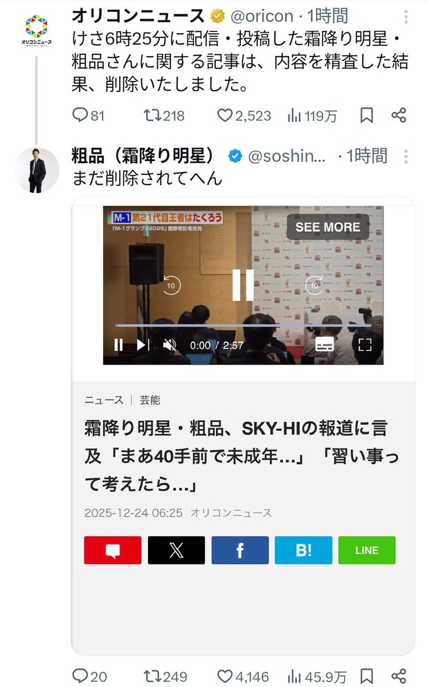 粗品、オリコンニュースにブチギレ「記事消せや」