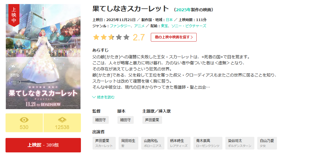 上映中に星3以下になるとかほとんどない事だよ2 名前:名無しさん@おーぷん[] 投稿日:25/11/21(金) 18:49:12 ID:uXcy逆に見てみたい3 名前:名無しさん@おーぷん[] 投稿日:25/11/21(金) 18:50:08 ID:2ukc予告からしてつまらなそうすぎたもん脅されてクソ映画作らされたんかってレベル4 名前:名無しさん@おーぷん[] 投稿日:25/11/21(金) 18:51:05 ID:gTk1ろくに感想も書いてもらえてなくて草------Audible で『三体』シリーズ やっとこさ 聞き終わってから 久しぶりの映画館。細田作品『時かけ』ぐらいしか見てないし、覚えてないし。Audible『三体』いやぁ~面白かった。オススです。続きを読む