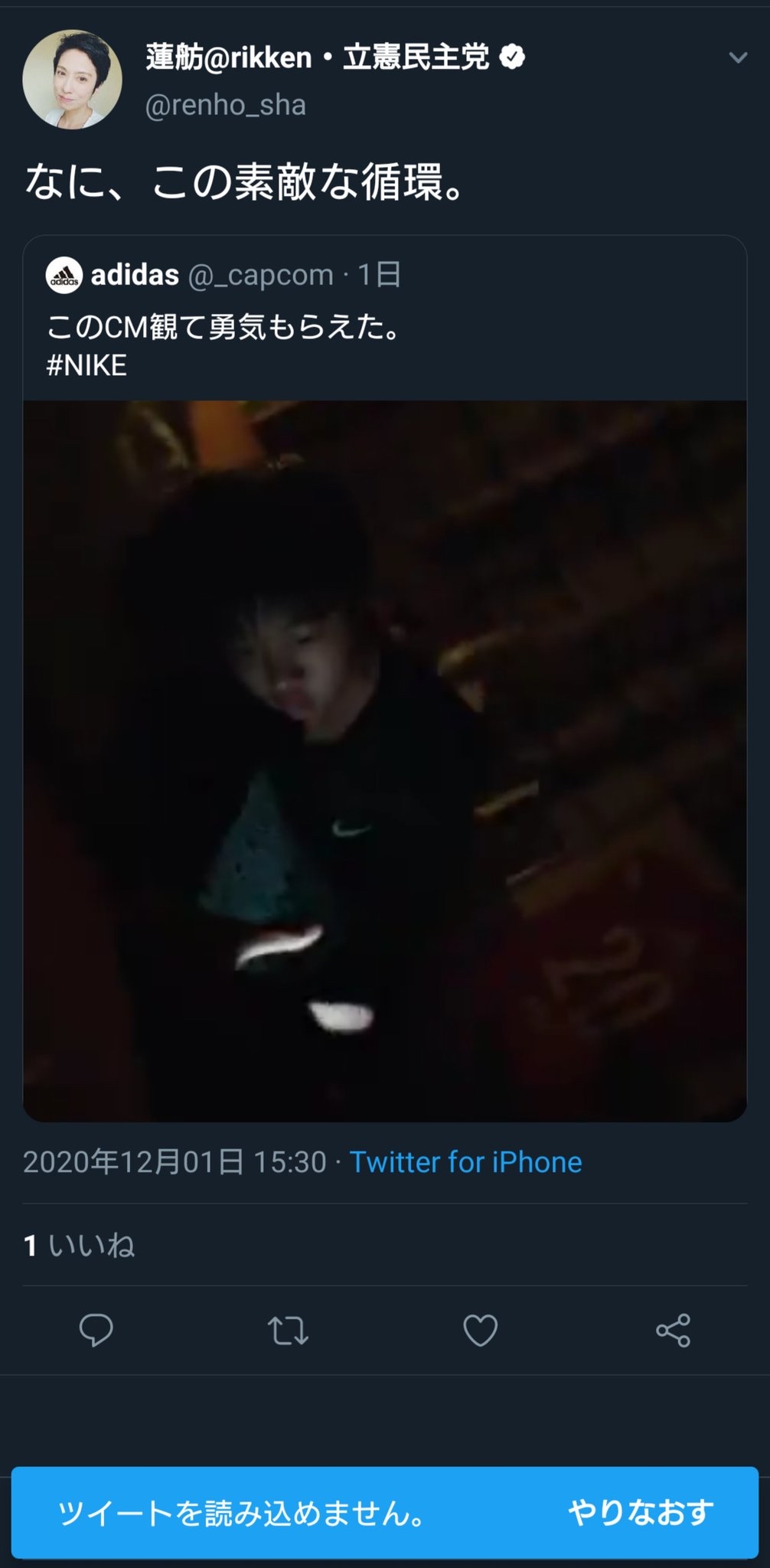 蓮舫「なに、この素敵な循環」 ナイキムCMに反応したAdidasの偽アカウントを引用RT→削除
