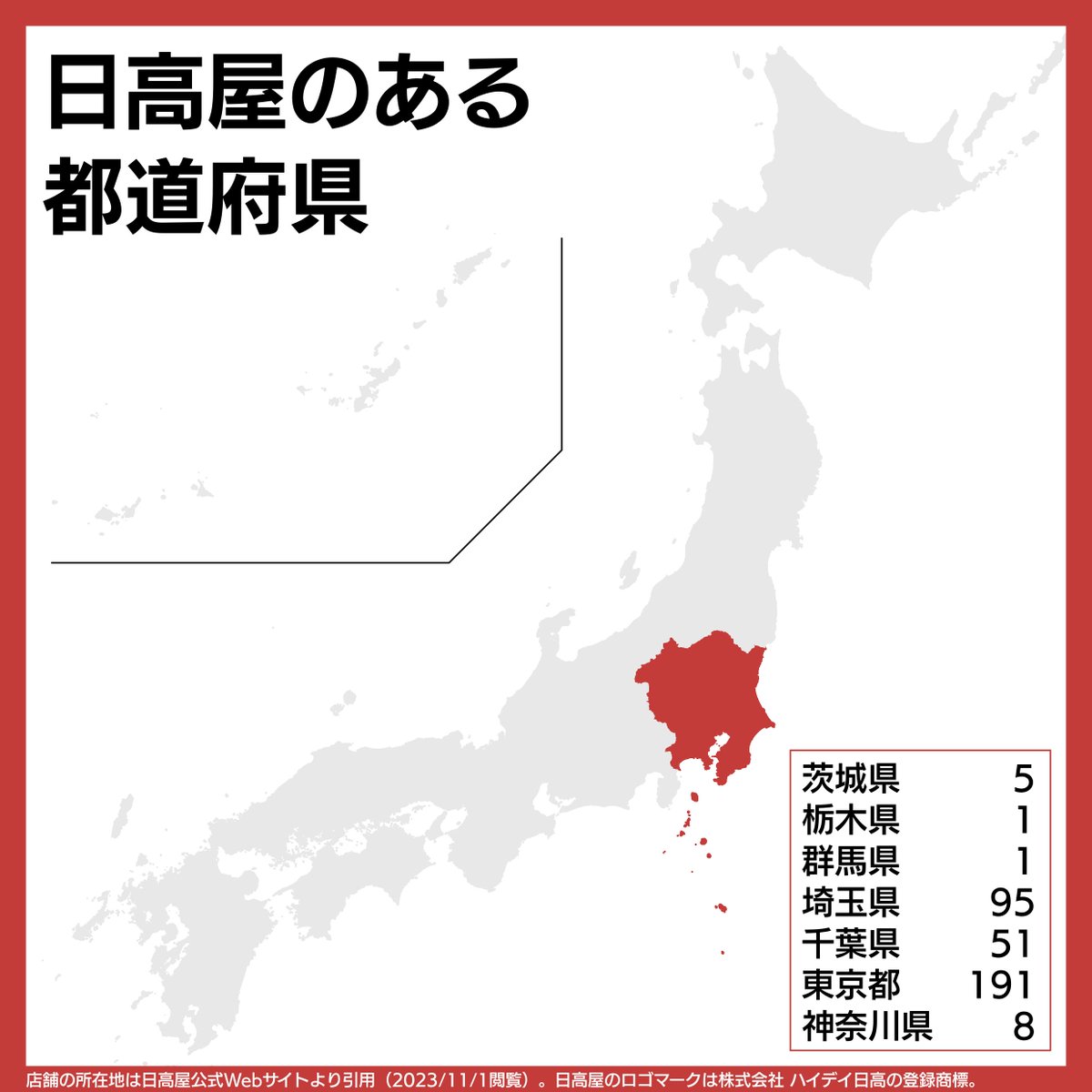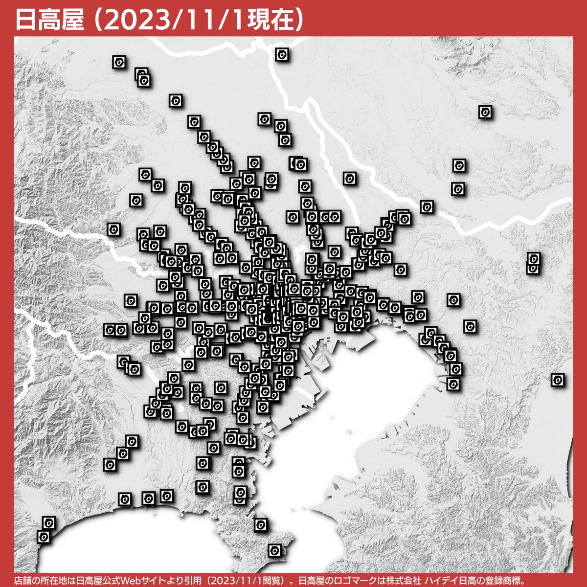日高屋、調べてみたら正真正銘の関東ローカルでびっくりした。しかも、ほとんどのお店が駅前にあるから、地図にすると「路線図」が浮かび上がってくる。これは文字通り「首都圏駅前三種の神器」だな・・・。