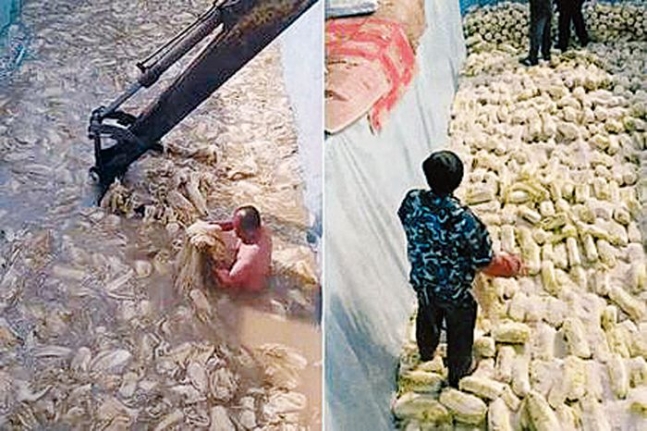 インターネット上で拡散している中国のキムチ工場の動画のスクリーンショット。白菜は汚い水で漬けられており、さびた重機と裸の労働者が白菜をかき回している=左の写真=。右の写真は、地面を掘った所で大根を漬けている様子。写真=NEWSIS