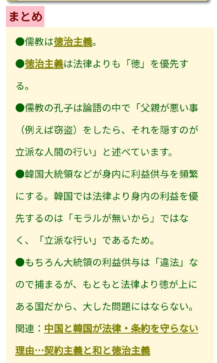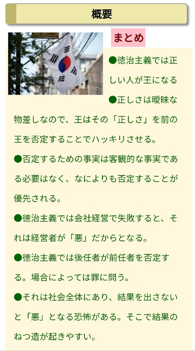 徳治主義●徳治主義では正しい人が王になる●正しさは曖昧な物差しなので、王はその「正しさ」を前の王を否定することでハッキリさせる。●否定するための事実は客観的な事実である必要はなく、なによりも否定することが優先される。●徳治主義では会社経営で失敗すると、それは経営者が「悪」だからとなる。●徳治主義では後任者が前任者を否定する。場合によっては罪に問う。●それは社会全体にあり、結果を出さないと「悪」となる恐怖がある。そこで結果のねつ造が起きやすい。●日本と中韓は文化・思想が違う。●本来の徳治主義は「法」より「徳」が上回ること。詳細は「法治と徳治」から。(省略)全文 https://nihonsinwa.com/page/704.html