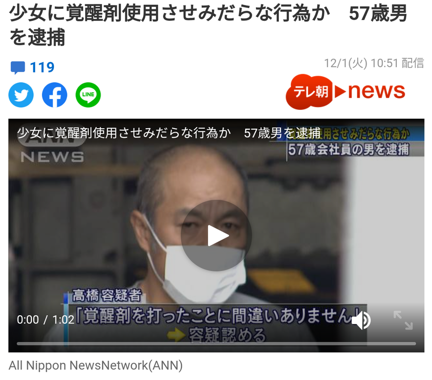 1: ジャコビニ・チンナー彗星(SB-Android) [GB] : 2020/12/01(火) 13:15:12.65 ID:bt3gBZ+50● BE:866556825-2BP(4500)少女に覚醒剤使用させみだらな行為か 57歳男を逮捕