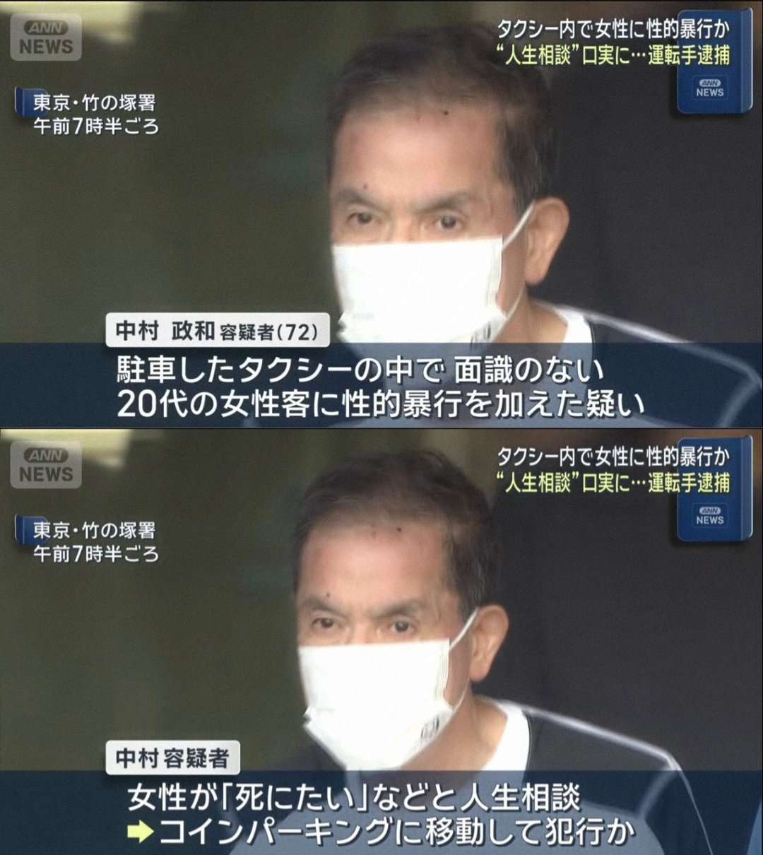 「死んじゃだめだよ」などと言い、女性客に性的暴行か 72歳タクシー運転手逮捕https://news.ntv.co.jp/category/society/df4d677cb481450e9e0505dace761b0fなんでや…3 名前:名無しさん@おーぷん[] 投稿日:25/09/18(木) 19:46:09 ID:ayZrわりとガチでこの性欲には憧れる4 名前:名無しさん@おーぷん[] 投稿日:25/09/18(木) 19:46:16 ID:MMlqまあそんな若いことやれたんなら捕まっても本望やろ6 名前:名無しさん@おーぷん[] 投稿日:25/09/18(木) 19:46:22 ID:YtVx女性は酒に酔っていて、身の上話をして「死にたい」などと言ったところ、中村容疑者は「君みたいなかわいい子が死んじゃだめだよ」などと言って性的暴行を加えたとみられる調べに対し中村容疑者は「行為は間違いなく全て私がやりました。相手もそれに合意してくれていたと勝手に思っていました」と容疑を否認しているとのこと続きを読む