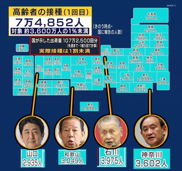 ↓国「107万2500回分出荷したぞ」 自治体「7万4852回接種したよ」