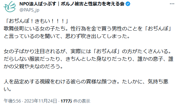 「おぢんぼ!きもい!!!」歌舞伎町にいる女の子たち。性行為を金で買う男性のことを「おぢんぼ」と言っているのを聞いて、思わず吹き出してしまった。…— NPO法人ぱっぷす|ポルノ被害と性暴力を考える会 (@PAPS_jp) November 24, 2023 スケベ漫画のネタかな2 名前:名無しさん@おーぷん[] 投稿日:23/11/29(水) 15:05:31 ID:vvuBウシジマくんにいそう4 名前:名無しさん@おーぷん[] 投稿日:23/11/29(水) 15:06:32 ID:AfCO草5 名前:名無しさん@おーぷん[] 投稿日:23/11/29(水) 15:06:48 ID:8Hz4金で買われる女を見ても笑ってやれよ7 名前:名無しさん@おーぷん[] 投稿日:23/11/29(水) 15:07:09 ID:dpMu金で売ってる女も十分キモいから…続きを読む